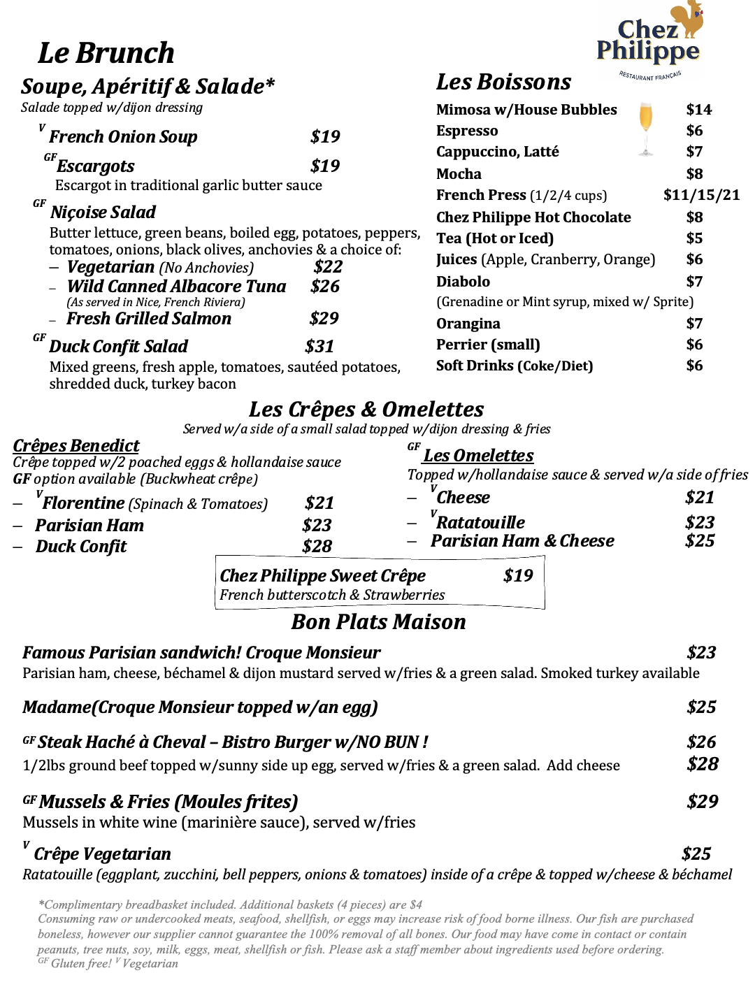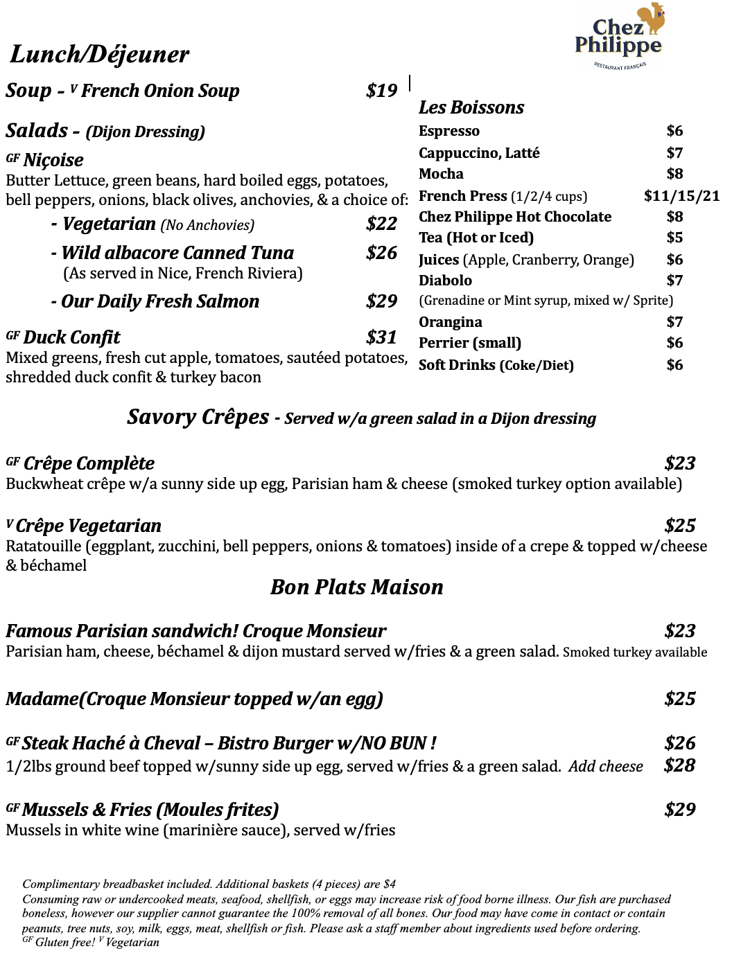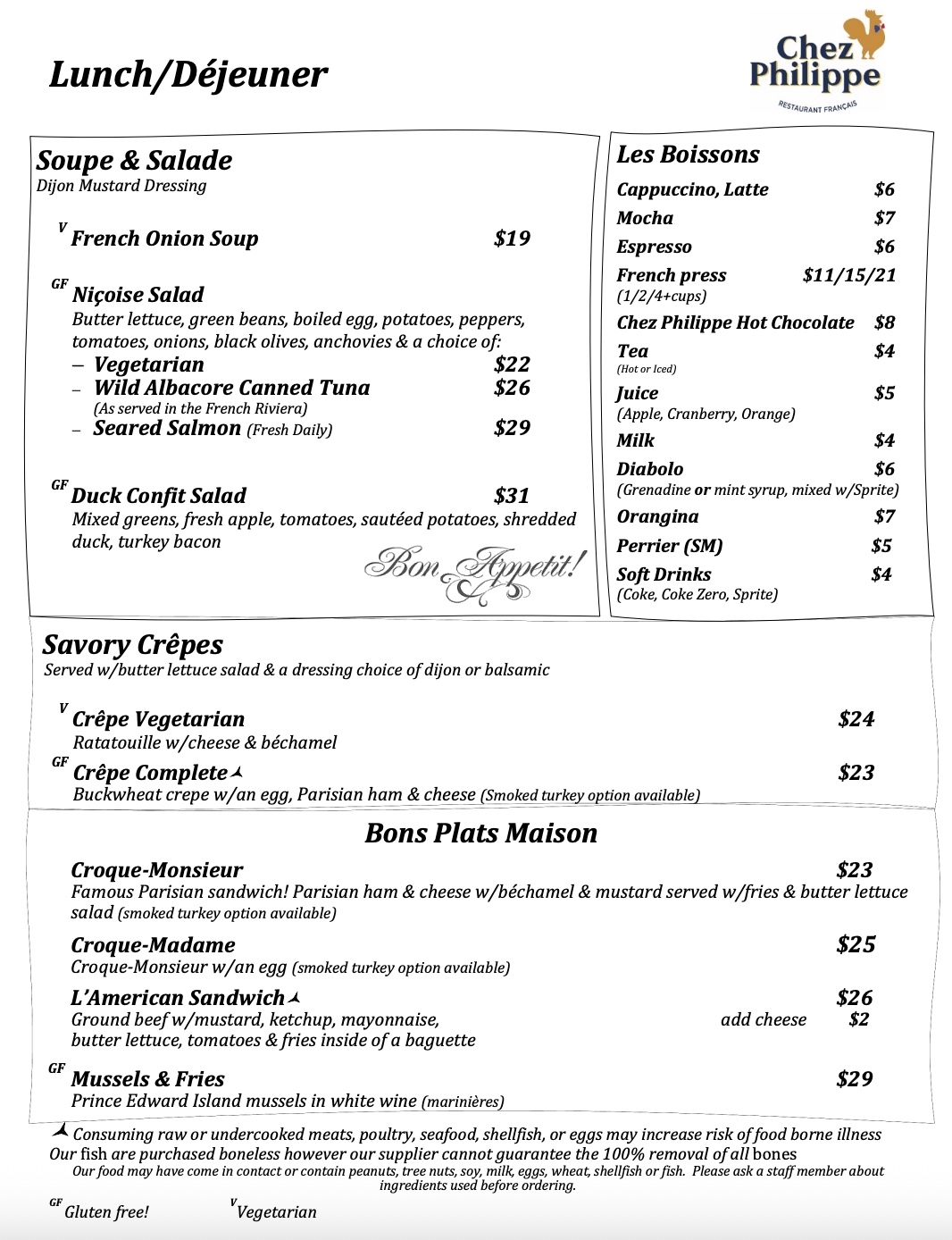 Stop by for lunch and try our savory crêpe! We also recommend the Niçoise salad, and one of the chef’s favorites L’American Sandwiche!